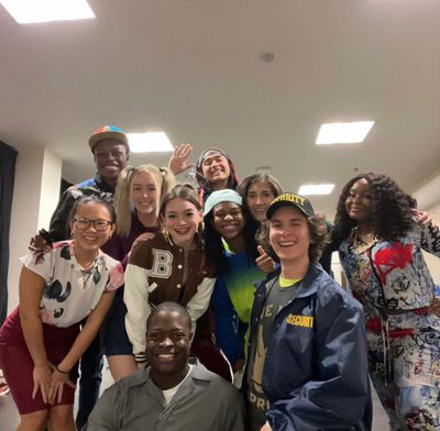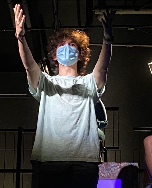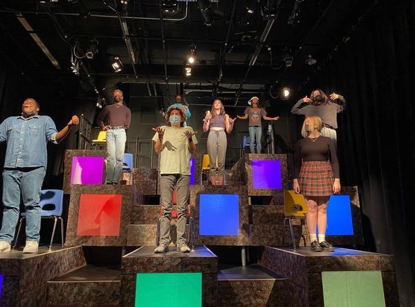 The set design by Sean Blue and Ricardo Melendez was pretty in-genius. So, because schools still had to abide by the 6-foot distance rule recommended by the CDC and implemented by the School Board, the set was created in boxes. 9 boxes, elevating the farther upstage you went. The tallest boxes were 9 feet tall and the shortest 3 feet (I was dead center on the bottom row on a 3 foot box). It was configured in such a way that we were always 6 feet away from each other and therefore were able to remove our masks as we performed for the live audience in the Black Box.